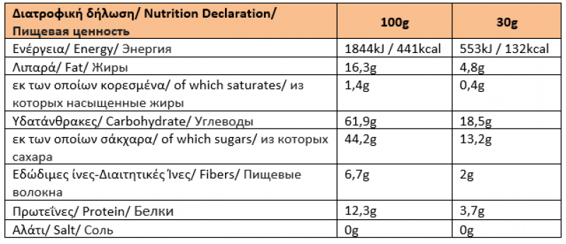 Honey 40%, Sesame 39%, Cranberry 14% (cranberries, pineapple juice, sunflower oil), Gojiberry 7%, Cinnamon.